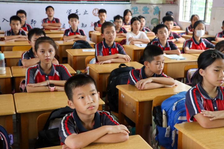 图为广东石油化工学院“绿创使者”实践团队成员在露天矿小学讲“绿色环保”课程,孩子们认真听讲的场景。