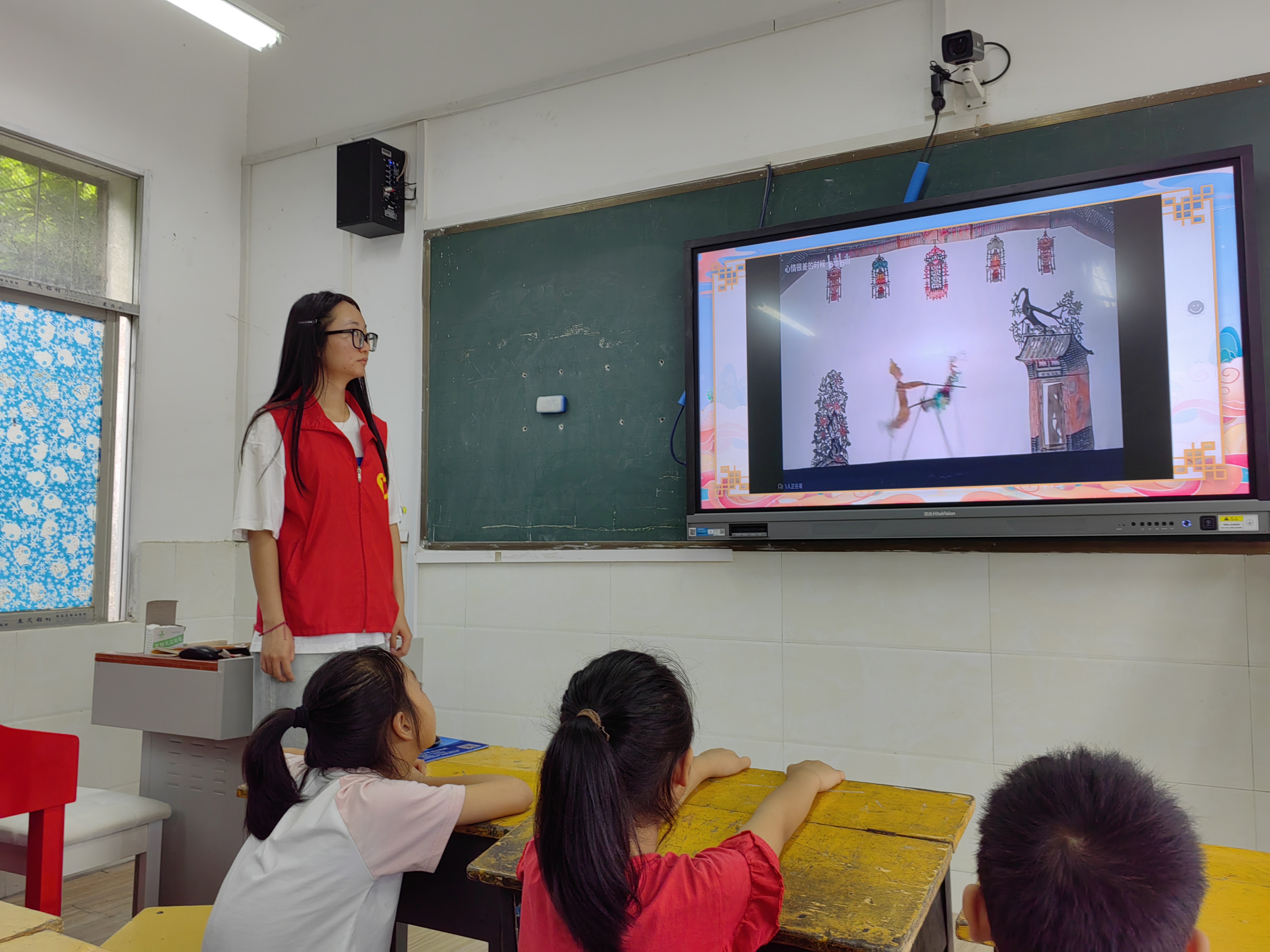 图为志愿者媛媛老师带领同学们学习皮影戏知识的场景。社会实践网通讯员 耿艺 供图